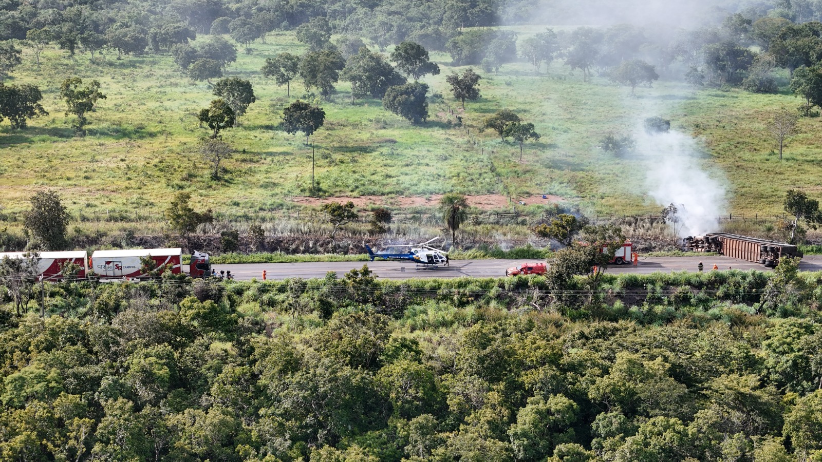 Paralelamente ao atendimento às vítimas, os bombeiros combateram o incêndio na carreta, que atingiu apenas a cabine, sem afetar a carga de gado que era transportada. Dos 10 animais, apenas dois sofreram fraturas aparentes em decorrência da colisão. Além de atingir a carreta, as chamas se espalharam à vegetação às margens da rodovia. Os bombeiros realizaram o combate ao incêndio até sua completa extinção.