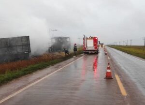 No local haviam duas vítimas, uma delas se queixava de ferimentos e dores nos membros inferiores (quadril e abdômen), sendo encaminhada a Unidade de Pronto Atendimento (UPA) por terceiros. A outra vítima, foi encontrada já em óbito, no interior de uma das carretas. A guarnição fez a preservação do corpo até a chegada da Politec. Após extinção do incêndio e término dos serviços, a equipe de Bombeiros Militares realizou o resfriamento da carcaça das carretas e rescaldo do local, além de realizar a limpeza da pista.