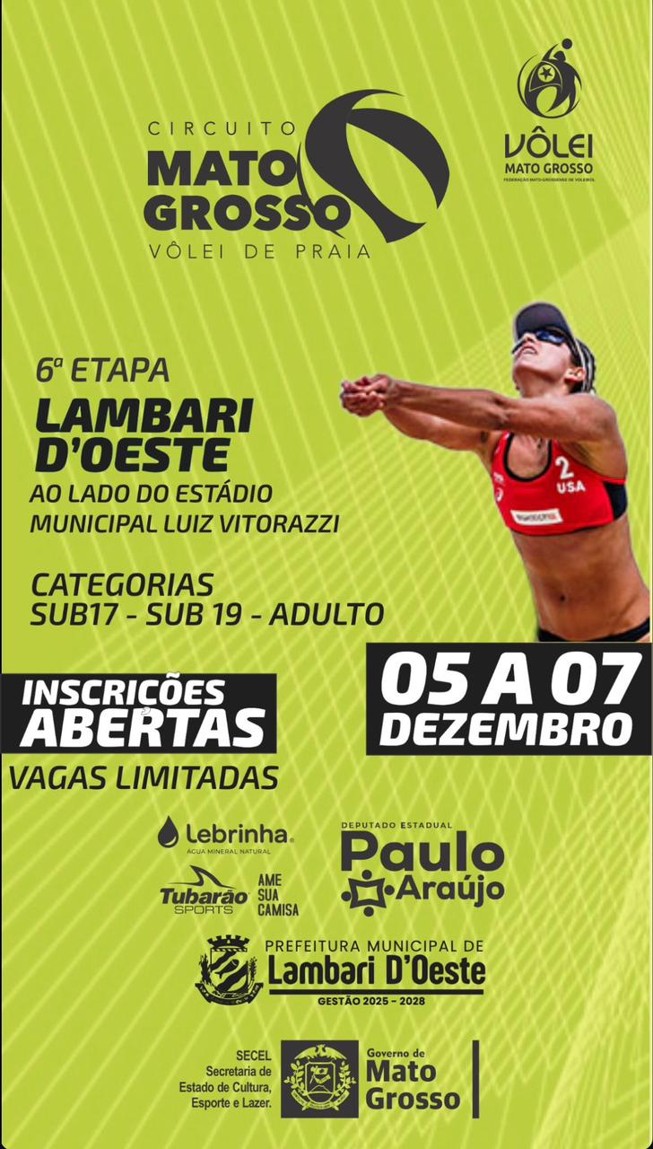 Lambari d’Oeste será sede da última etapa do Circuito Mato-grossense de Vôlei de Praia 2025, que acontece nos dias 5, 6 e 7 de dezembro, reunindo duplas de diversas regiões do país. O evento marca o encerramento das seis fases anuais da competição e vai contar com estrutura profissional, pontuação para ranking estadual e nacional, além de premiação total superior a R$ 23 mil.