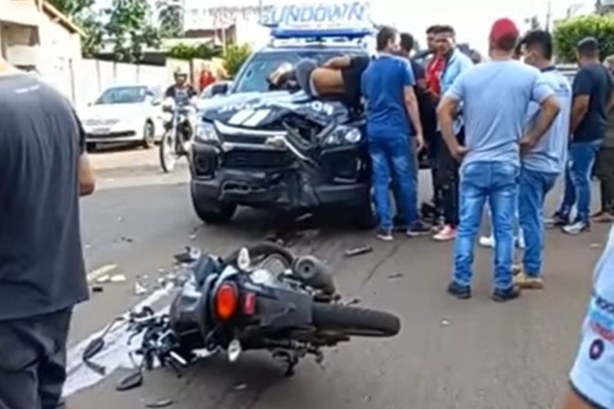 Um vídeo gravado por uma testemunha mostra o jovem ainda em cima da viatura. O veículo ficou com a parte frontal danificada e a moto ficou destruída.