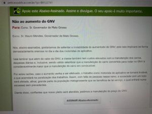 A petição foi articulada pelo Sindicato dos Motoristas de Aplicativos de Mato Grosso e outras lideranças. “Vamos respeitar todo o passo-a-passo dos trâmites legais. Pedimos que o motorista de aplicativo e seus dependentes assinem essa petição para mostrarmos união da categoria”, convoca Queiroz.