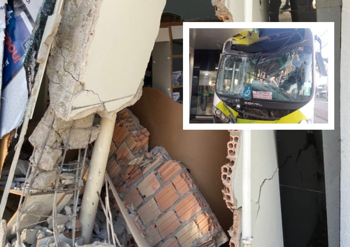 Parte da parede da farmácia foi derrubada, a frente do ônibus ficou toda danificada.