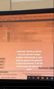 “Faltando 10 minutos para minha hora de dormir, chega mulher enfartando e com edema agudo no pulmão e agora já passou 1h30 da minha hora de dormir. Tô puta”, publicou a jovem nas redes sociais.