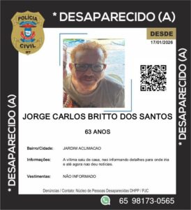 Equipes da Polícia Civil estão fazendo buscas para localizar o empresário Jorge Carlos Britto dos Santos, de 57 anos, desaparecido desde a manhã de sábado (17), em Cuiabá. Ele saiu de seu estabelecimento comercial informando que iria ao Distrito do Coxipó do Ouro e desde então não deu mais notícias, mantendo o celular inacessível.
