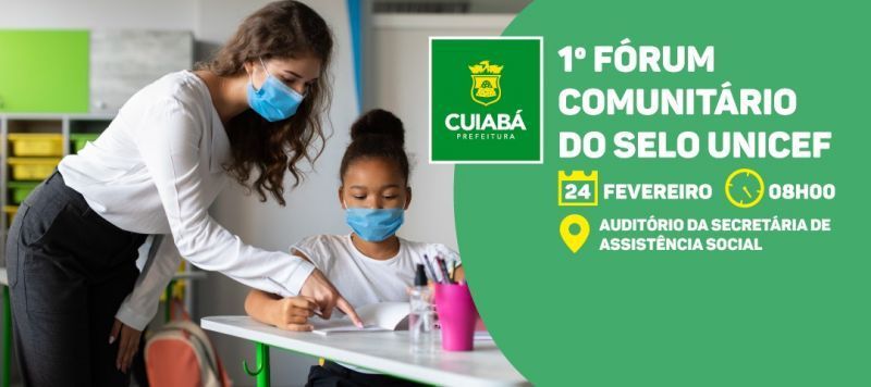 A Prefeitura de Cuiabá, por meio da Secretaria Municipal de Educação, realiza no dia 24, às 8h, no auditório da Secretaria Municipal de Assistência Social, Direitos Humanos e da Pessoa com Deficiência (SADHPD) o 1º Fórum Comunitário do Selo Unicef. O evento tem como objetivo a elaboração do plano de ação de Cuiabá pelos direitos das crianças e dos adolescentes. O evento seguirá todos os protocolos de biossegurança.