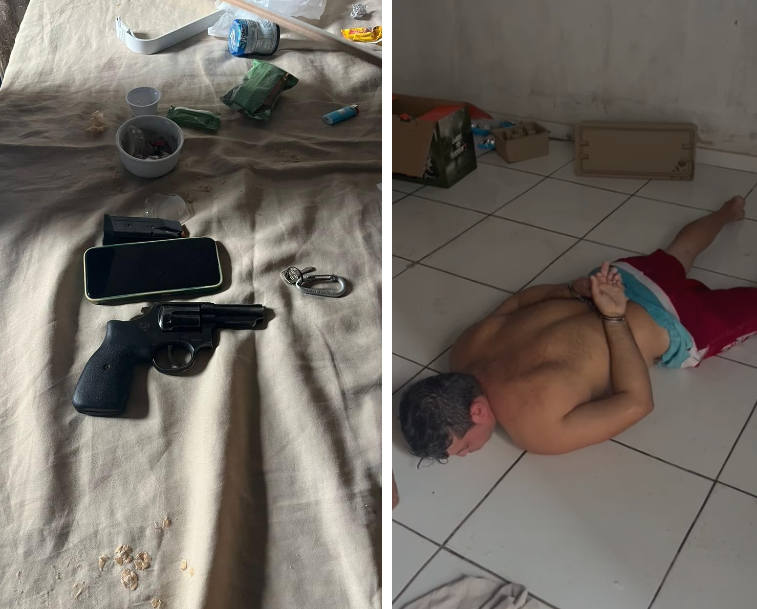Diante do flagrante, os policiais abordaram o suspeito e realizaram buscas na residência, onde apreenderam um revólver, um carregador de pistola e substâncias semelhantes à cocaína e à maconha, já embaladas para comercialização