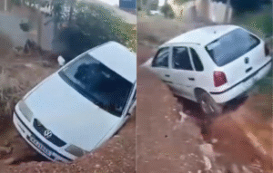 Um motorista perdeu o controle da direção e teve o carro preso em um buraco na Rua Vitória, no bairro Parque Del Rey, em Várzea