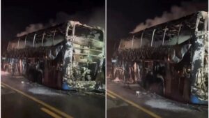 Um ônibus com 40 pessoas a bordo foi completamente consumido por um incêndio na madrugada da última sexta-feira (2), na rodovia MT-358, nas proximidades da