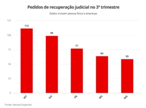 Mato Grosso registrou o maior número de pedidos de recuperação judicial no setor agropecuário no terceiro trimestre deste ano. Foram 112 solicitações no período, conforme