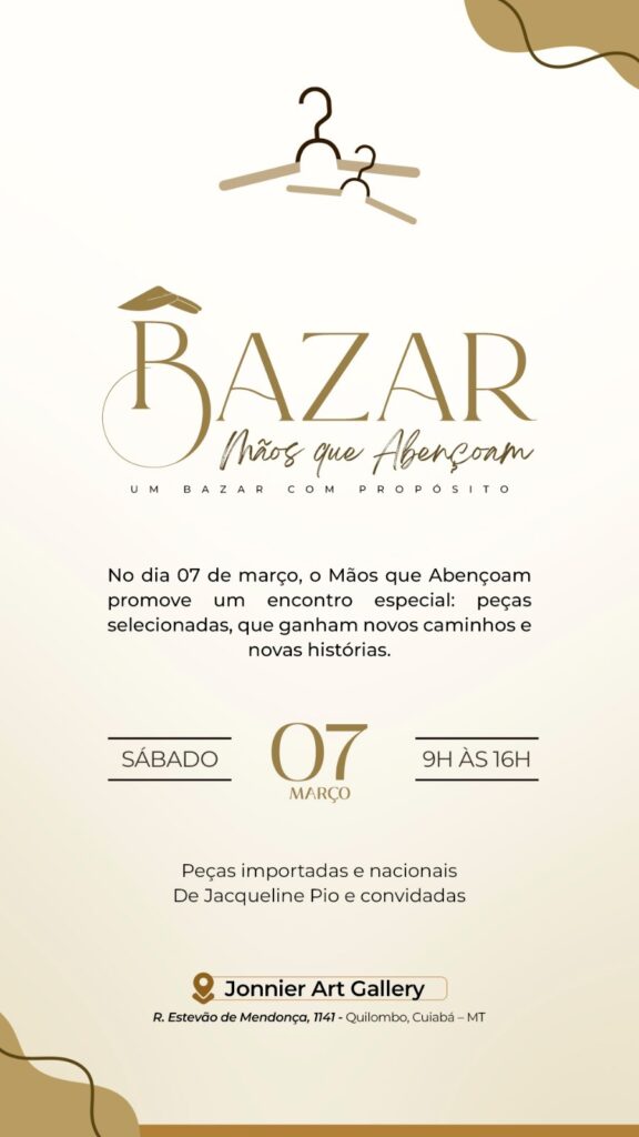 Cuiabá recebe no dia 7 de março, das 9h às 16h, o Bazar Mãos que Abençoam, evento solidário idealizado pela produtora rural Jacqueline Pio. A iniciativa será realizada na Jonnier Art Gallery como parte das ações do projeto durante o mês da mulher.