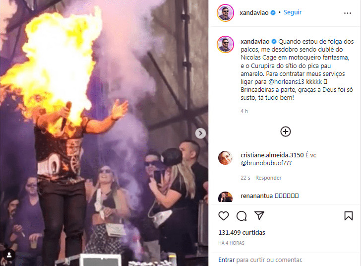 No Stories, Xand Avião explicou que foi atingido pelo fogo, mas teve apenas uma queimadura leve. “Foi mais um susto, uma queimadura leve no braço. Bem leve mesmo, tanto que foi no meio do show, faltava uns 25 minutos para acabar o show, e eu continuei. Perdi os cabelos do braço, fiz uma depilação à força, mas está tudo bem”, disse.